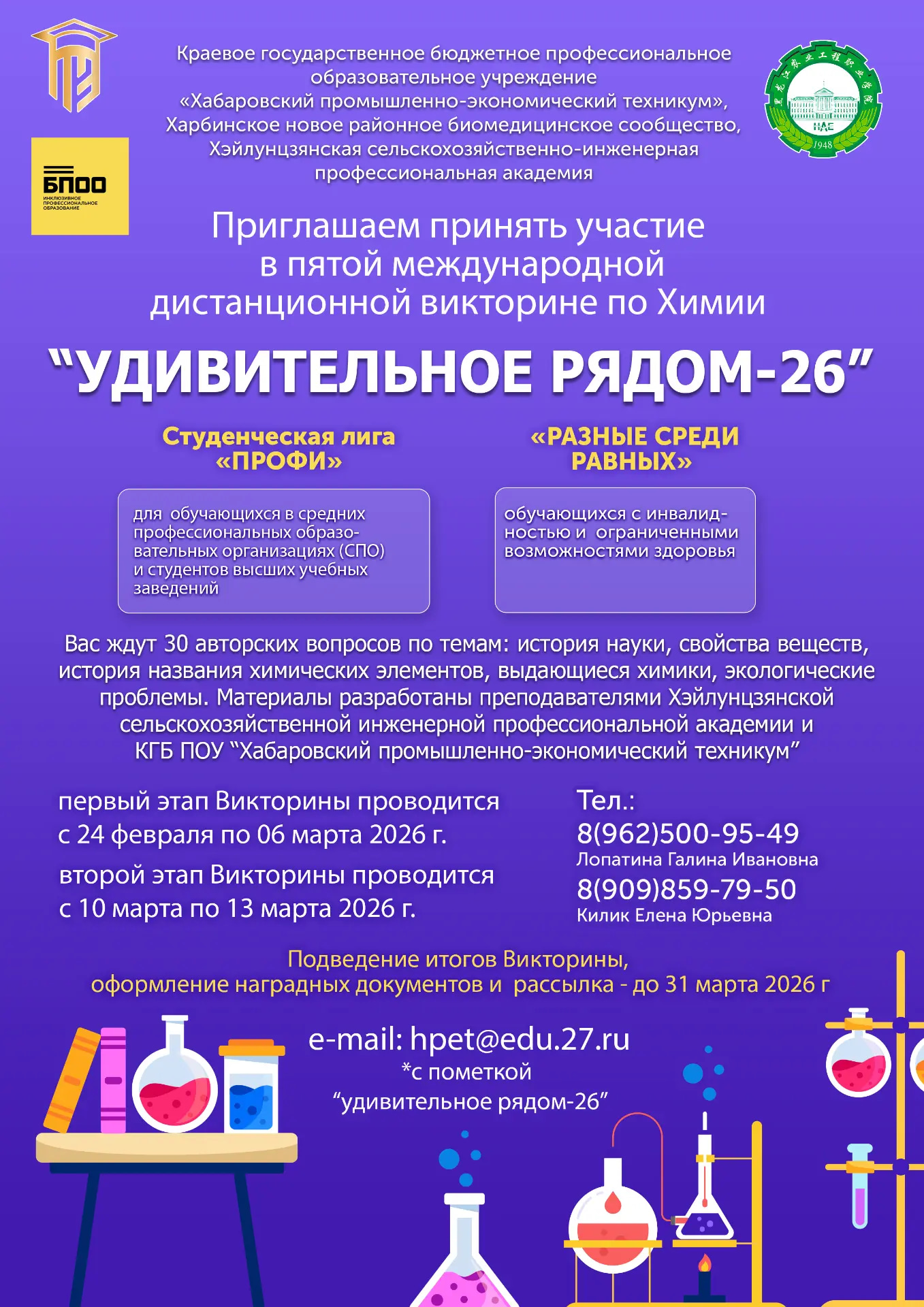 V Международная дистанционная Викторина по химии"УДИВИТЕЛЬНОЕ РЯДОМ-26"для обучающихся и лиц ОВЗ(РОССИЯ-КИТАЙ) Викторина включена в государственное задание на оказание государственных услуг распоряжением Министерства образования и науки Хабаровского края на 2026 год( приказ №1675 от 22.12.2025)